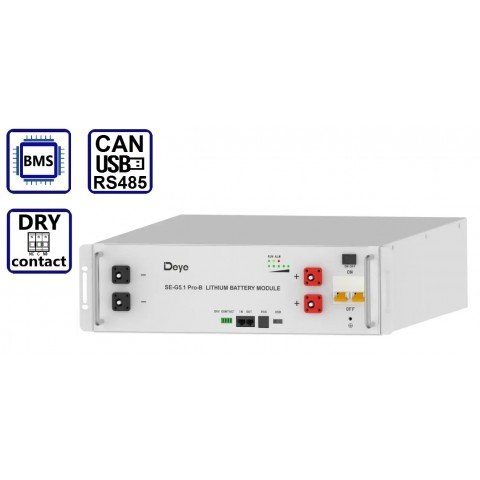 Акумулятор Deye SE-G5.1 PRO-B оснащений просунутою системою управління BMS, яка стежить за його роботою, запобігаючи перегріву, перезаряду та надмірному розряду. Для інтеграції в різні системи передбачені інтерфейси CAN2.0, RS485, USB та сухий контакт. Корпус має клас захисту IP20, що забезпечує захист від пилу та дозволяє використовувати в безпечних умовах. При масі 45 кг і габаритах 440 х 133 х 540 мм, прилад може бути встановлений на стіну, підлогу або стійку, залежно від потреб. Робочий діапазон температур для розряду становить від 0°C до +55°C, а для заряду – від -20°C до +55°C, що робить апарат універсальним для функціонування різних кліматичних умовах.