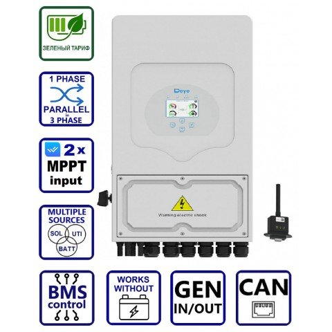 Інвертор Deye SUN-6K-SG05LP1-EU, LV (6kW, 48V, 1Ph, 2-MPPT) Wi-Fi є сучасним пристроєм з високою функціональністю, призначеним для використання в системах сонячної генерації. Це однофазний інвертор з номінальною потужністю 6000 ВA (6000 Вт) та можливістю роботи як з акумуляторними батареями, так і без них. Підтримується подача надлишкової сонячної енергії в мережу, а також паралельне підключення до 16 пристроїв, що робить це обладнання ідеальним рішенням для енергосистем, що масштабуються.