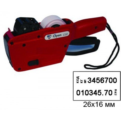 Етикет пістолет Open С20/A - це механічне обладнання, за допомогою якого маркують товар самонаклейними етикетками розміру 26х16 мм. Даний етикет-пістолет відрізняється від Blitz С20, наявністю не тільки цифрових символів, а й буквених у верхньому рядку, що дозволяє наносити слова або короткі фрази на етикетку. Нижній рядок містить цифрові символи, а також потроєні сиволи, які дають змогу розшифрувати значення цифр.