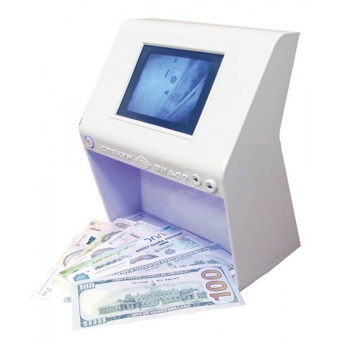 Базова комплектація детектора валют «Спектр-Відео-Євро» дозволяє здійснювати якісний інфрачервоний аналіз-контроль зображень грошових купюр на вбудованому моніторі і забезпечує 2-кратне збільшення зображення аналізованої банкноти в інфрачервоному спектрі. Контроль в УФ світлі та інфрачервоному спектрі детектор валют «Спектр-Відео-Євро» дозволяє проводити одночасно. Передбачено можливість контролю розміру грошових купюр, перевірки водяних знаків, захисної нитки та підключення оптико-магнітної миші. Детектор валют "Спектр-Відео-Євро" оснащений лампою фірми "Philips". Прилад має сучасний стильний вигляд.